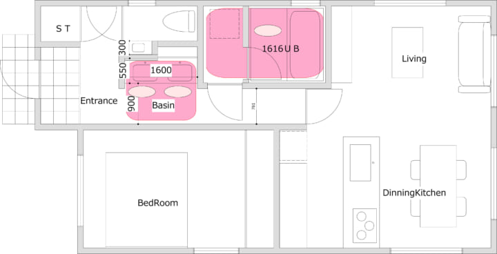 この場合のデメリットは半畳の収納スペースがなくなる、戸建て新築であればそれほど問題はないですが、戸建や集合住宅リノベーションの場合、既存の水まわりスペースから離れているので給排水ルートの設置が大変で、床下スペースがない集合住宅の場合不可能な場合もあります。