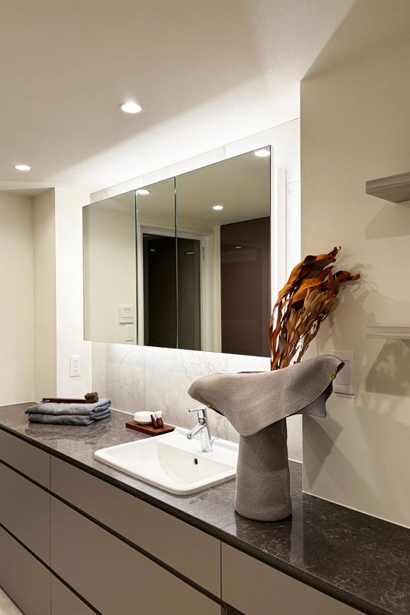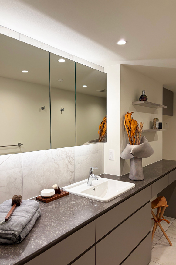 Powder Room Case 160 □仕様 サイズ:W3490×D600 カウンター:フィオレストーン 扉:メラミン化粧板 洗面器:陶器 オーダー洗面化粧台 事例160 WAILEAはお客様の理想の洗面所空間を実現するために、オーダー洗面化粧台の制作、インテリアデザインを賜っております。ご相談は無料ですのでお気軽にお問い合わせください。