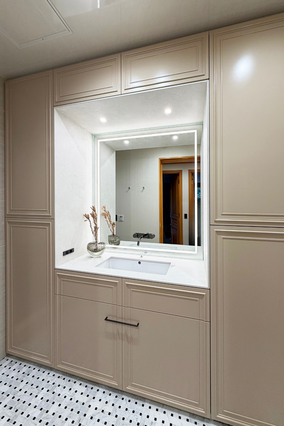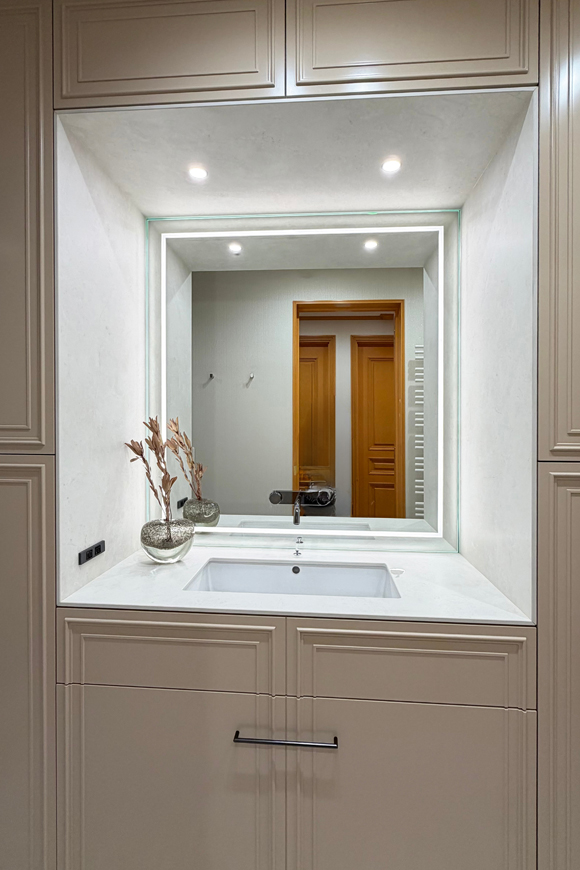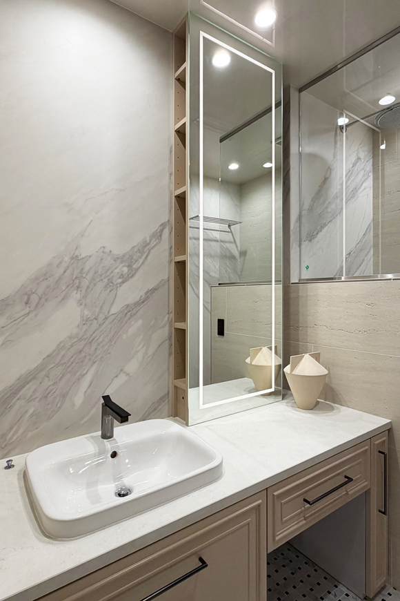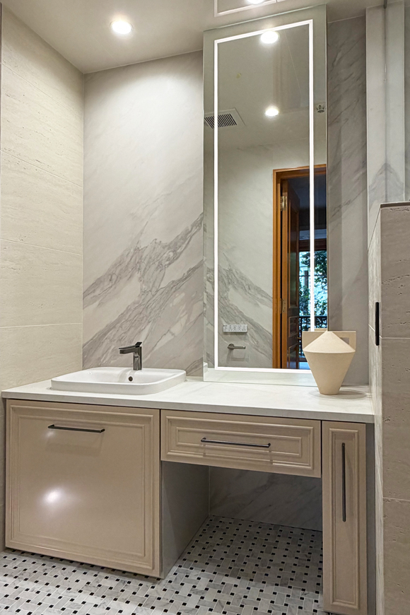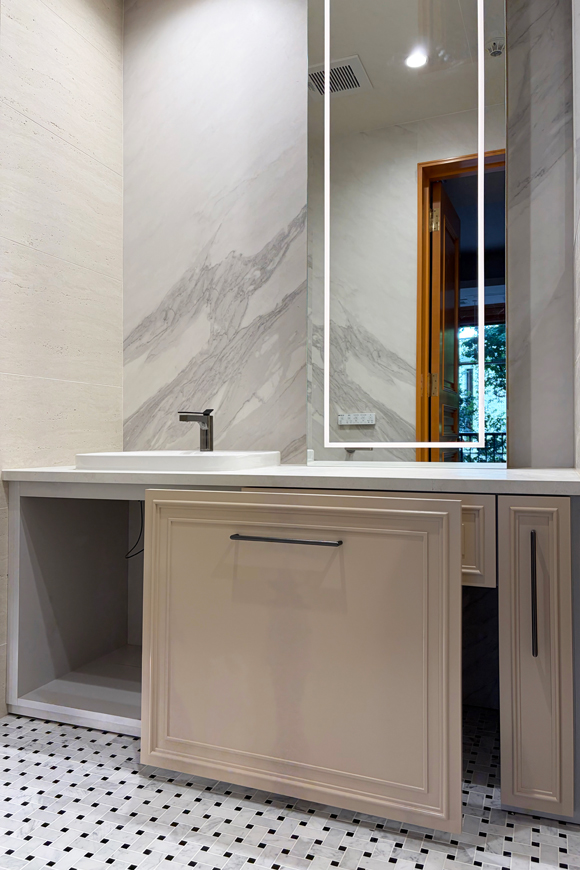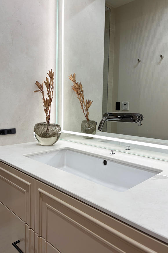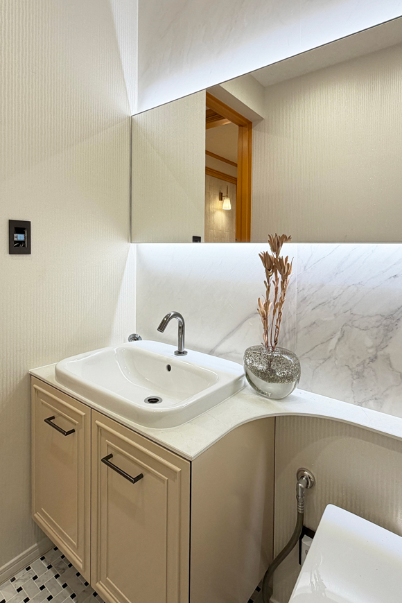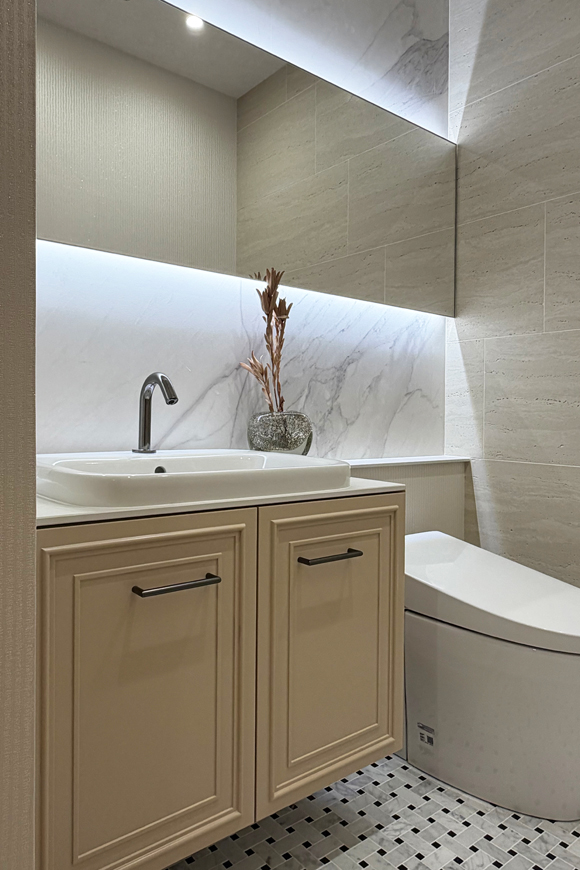 Powder Room Case 167 □仕様 サイズ:W2545×D545 カウンター:デクトン 扉:装飾モール塗装扉 洗面器:陶器 水栓:VERSE VR01L1-B オーダー洗面化粧台 事例167 同じご自宅のトイレ手洗い① トイレ手洗い② WAILEAはお客様の理想の洗面所空間を実現するために、オーダー洗面化粧台の制作、インテリアデザインを賜っております。ご相談は無料ですのでお気軽にお問い合わせください。